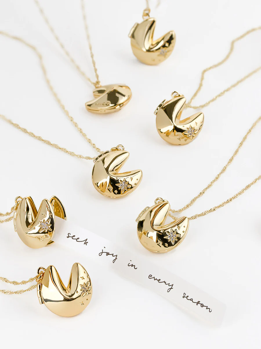 The Fortune Cookie Gold Locket Necklace is specially designed in the shape of a fortune cookie that opens up to store a special memory or keepsake. An eye-catching piece that will make any outfit look good, wear this piece as a symbol of good luck and fortune with a secret note tucked within the locket.