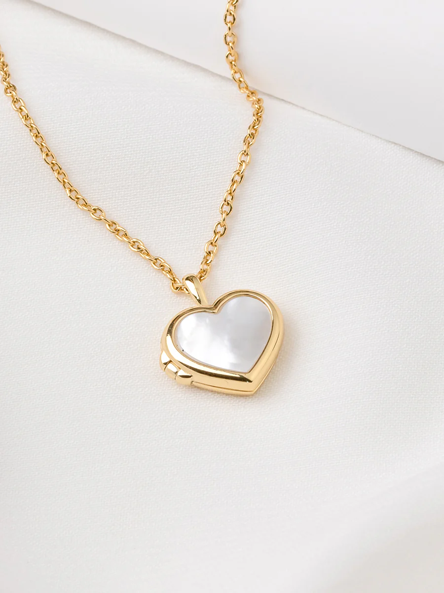 The Heart Mother of Pearl Gold Locket Necklace is a meaningful gift to yourself or someone special which features a sustainably sourced mother of pearl finishing on the outside and inside of the locket. Wear this piece on its own or layered with a dainty choker.
